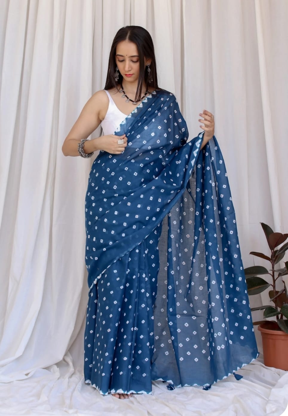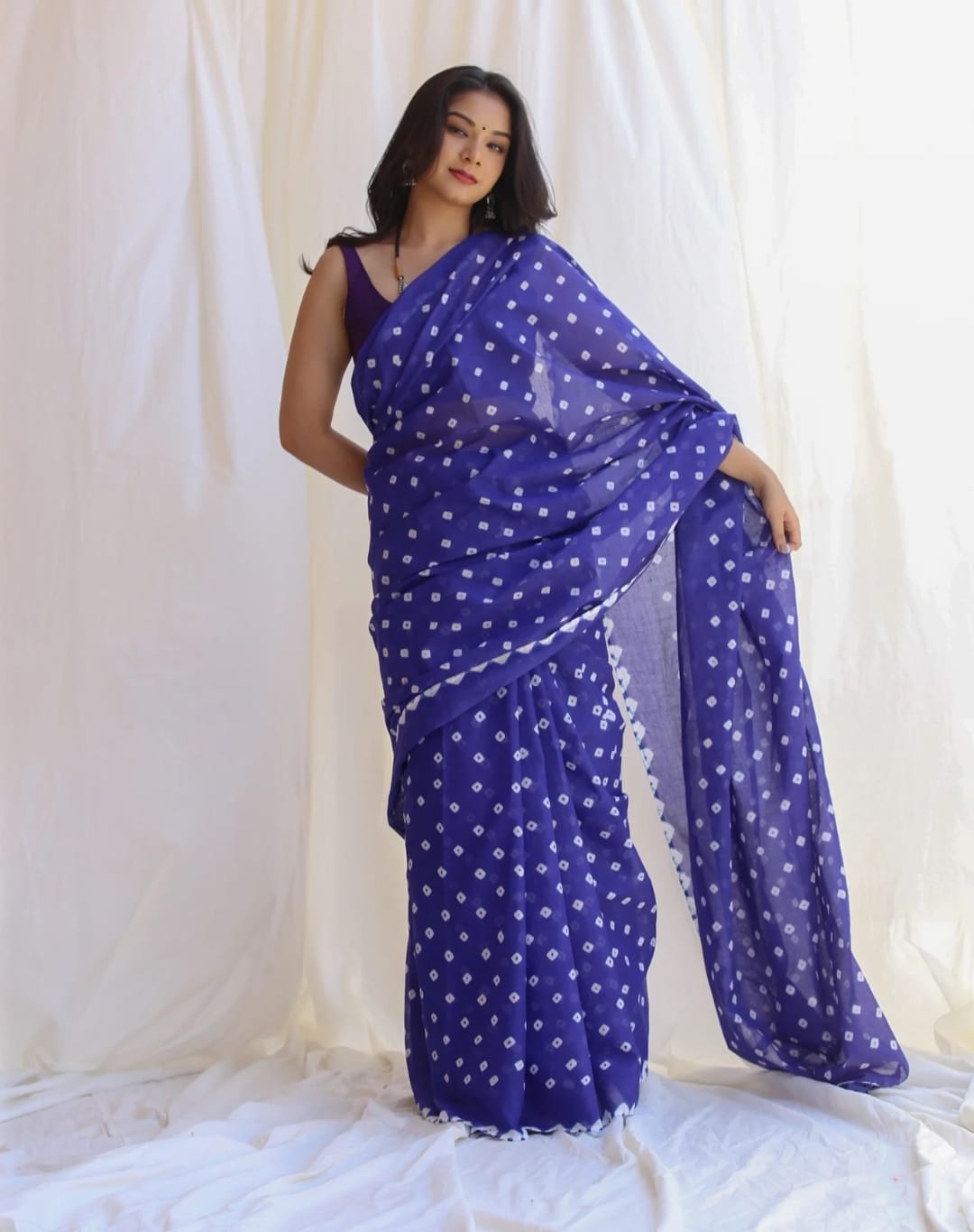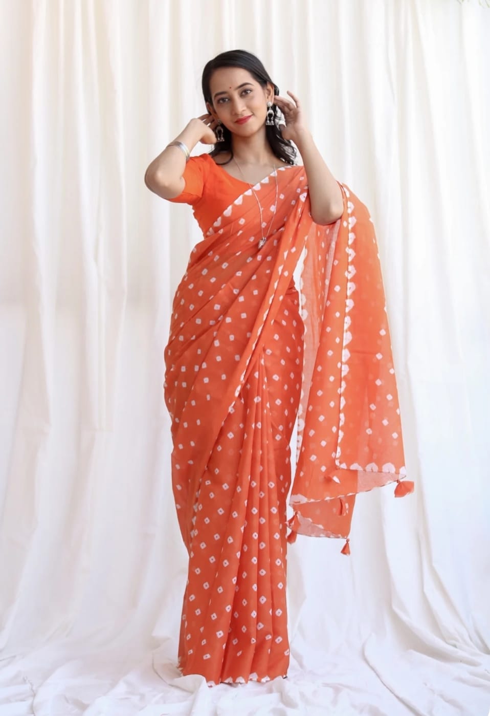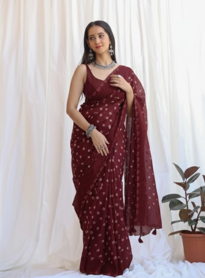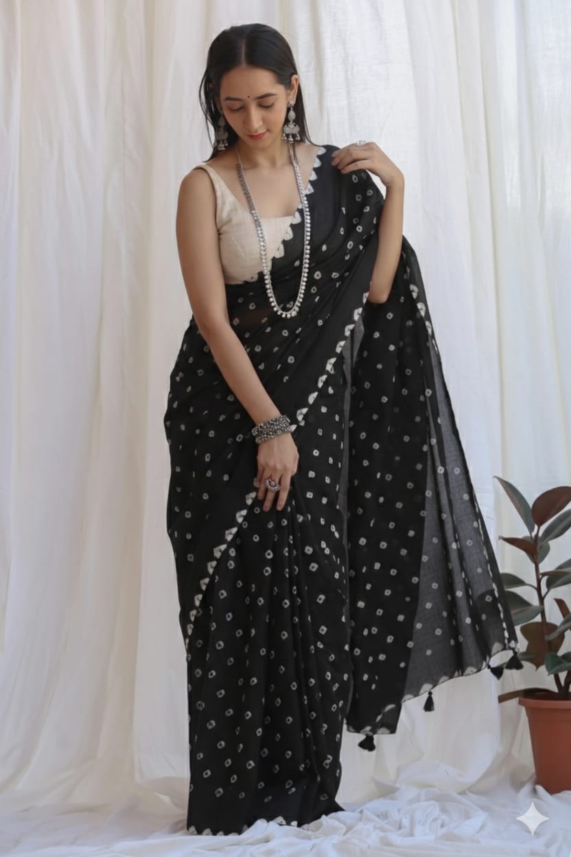 Featuring authentic handblock Bandhani prints, this saree reflects timeless Indian craftsmanship. The airy fabric drapes beautifully, making it ideal for daily wear, office wear, casual outings, and small festive occasions.