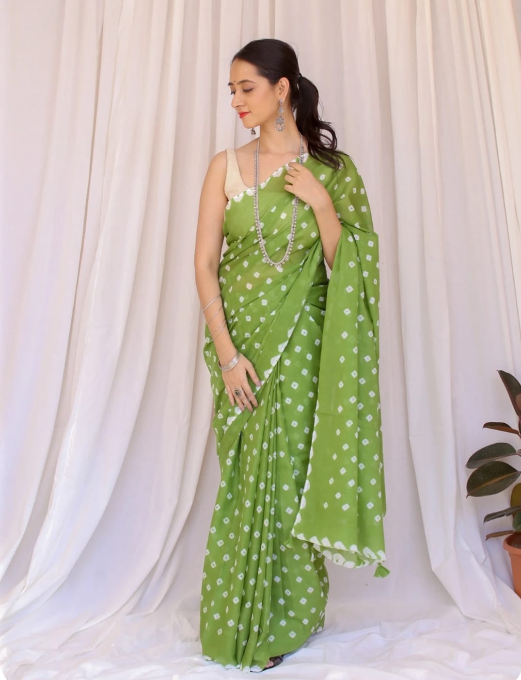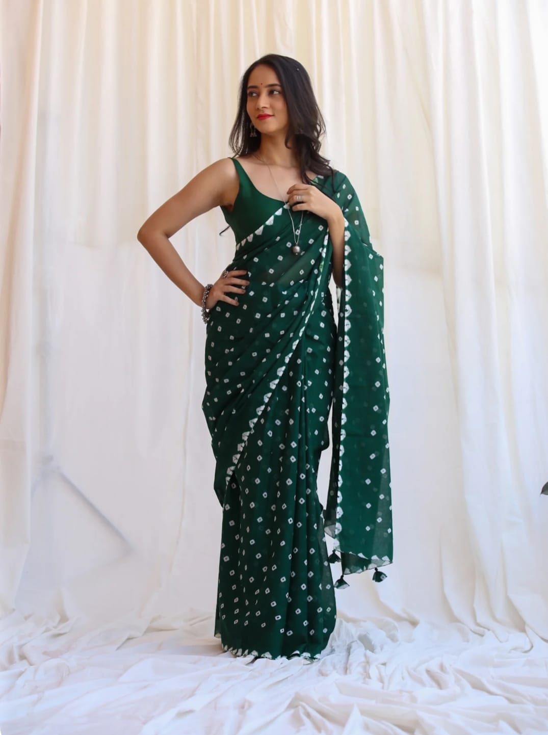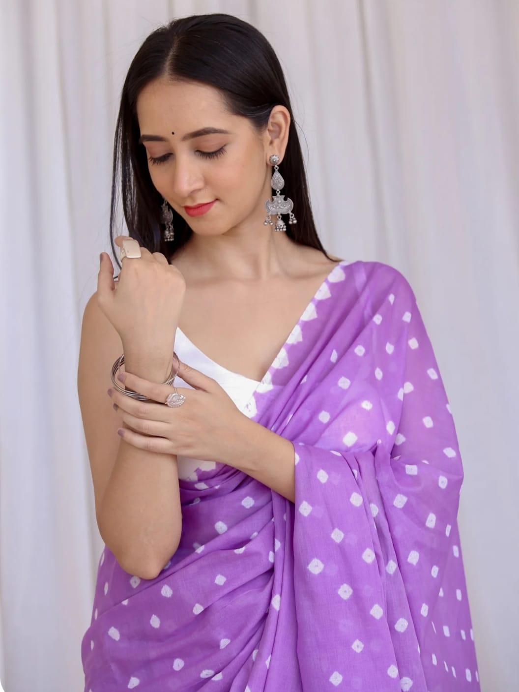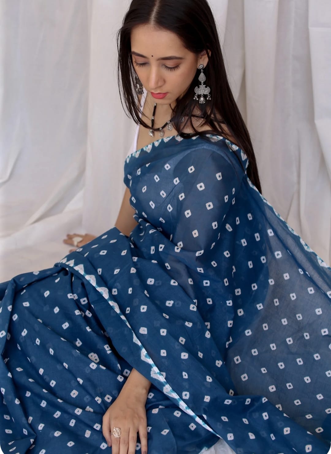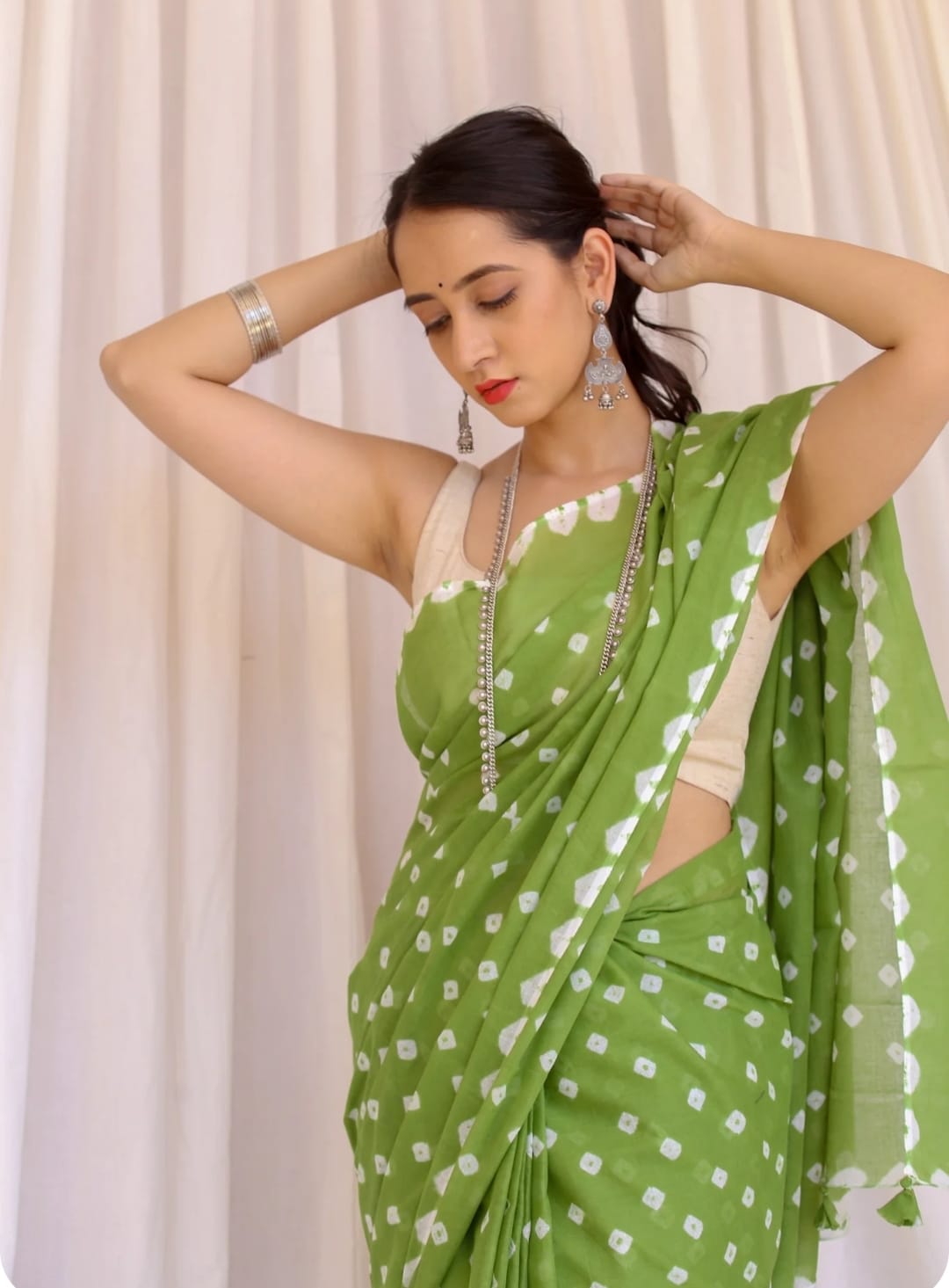 Featuring authentic handblock Bandhani prints, this saree reflects timeless Indian craftsmanship. The airy fabric drapes beautifully, making it ideal for daily wear, office wear, casual outings, and small festive occasions.
